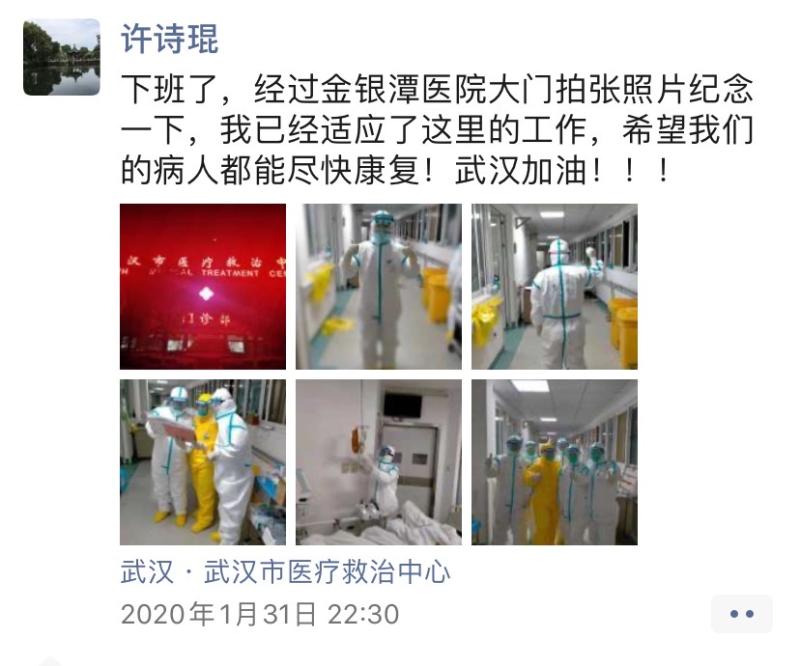 家人的支持给了许诗琨坚强的后盾。晚上10点半,许诗琨从武汉金银潭医院下班,经过大门口时忍不住拍了照片,他在朋友圈写到:“我已经适应了这里的工作,希望我们的病人都能尽快康复!武汉加油!”