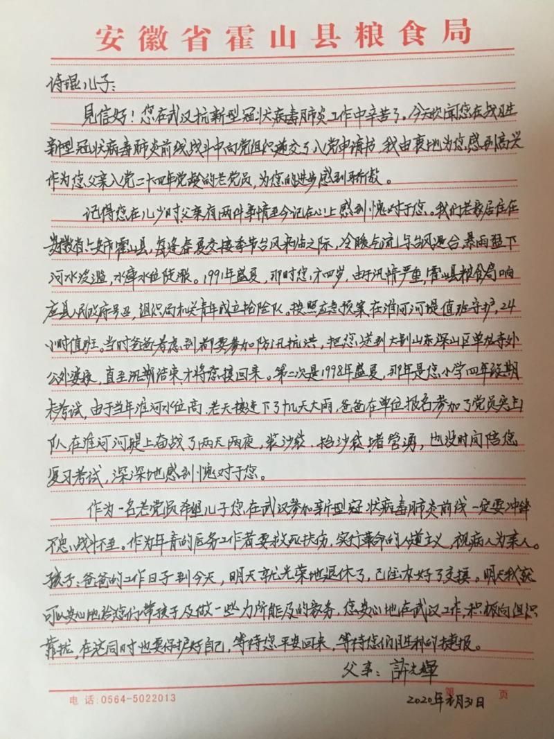 作为一名老党员,希望儿子您在武汉参加新型冠状病毒肺炎前线,一定要冲锋不止,战斗不息。作为年轻的医务工作者,救死扶伤,实行革命的人道主义,视病人为亲人。孩子,爸爸工作的日子到今天,明天就光荣的退休了,已经办好了交接。明天我就可以安心的给你们带孩子急做一些力所能及的家务,您安心的在武汉工作,积极向组织靠拢,在这同时也要保护好自己,等待您平安归来,等待你们胜利的捷报。