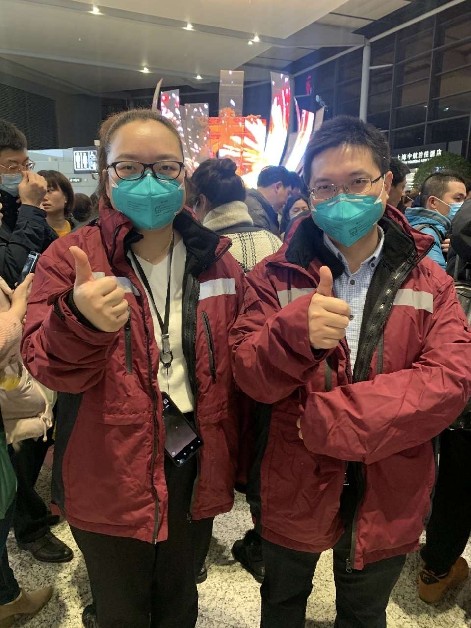 除夕夜,程克斌医生(右一)与王菁护士(左一)准备登机奔赴武汉