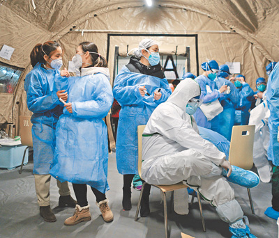 2月6日,驰援武汉的上海东方医院医疗队经过一下午紧张作业,搭建起24个专业的野战医疗帐篷营区,包含远程诊疗系统、药房、休息室、防护装备准备室等,为医护人员开展工作做好准备。