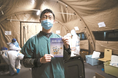 2月11日凌晨2时,是冯强的轮值时间。他和两位同事将三大摞《抗疫·安心》读本带进方舱。接下来,每一个班次的医生都会带一些读物到病区,分发给病患以及来自全国各地、在这里工作的医护人员。