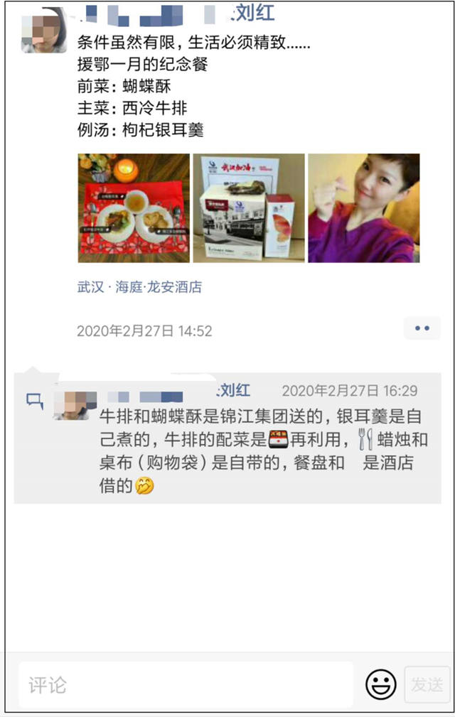 条件虽然有限,生活必须精致。援鄂一个月时,刘红DIY了一份纪念大餐。有前菜:蝴蝶酥;主菜:西冷牛排;有例汤:枸杞银耳羹。牛排和蝴蝶酥是锦江集团送给抗疫队员的,银耳羹是自己煮的,牛排的配菜是盒饭里“回收再利用”的,蜡烛和桌布(购物袋)是自带的,餐盘和刀叉是向酒店借的。