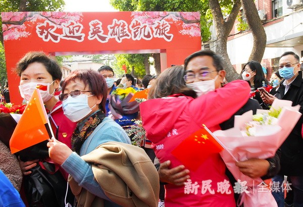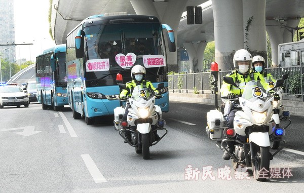 昨天下午3时许,当满载着杨浦区中心医院第三批援鄂医疗队解除隔离的50名队员一个都不少,从隔离点平安回来的大巴驶入杨浦的那一刻,杨浦交警支队的骑警们上前引导,一路护送医疗队“回家”。在道路两侧,每经过一处交警执勤岗位,都能看到民警向车队庄严敬礼,杨浦人用最高礼仪迎接这群新时代“最可爱的人”,迎接英雄们凯旋。随着车队缓缓驶到医院门口,所到之处,一片欢腾。长长的红毯一字铺开,前来迎接的人们激动地挥着手中的欢迎标语,大声呼喊着队员们的名字。同事、家属、以及闻讯赶来的群众挤在道路两旁,向英雄们致敬。这一刻,回家的喜悦洋溢在每个人的脸上……。