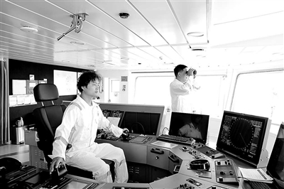 4月25日,“同济”号三副丁旭(左)和船长石斌(右)驾驶船舶赶往下一个考察站位。“同济”号是我国首艘海洋级智能综合科考船,目前正在南海北部执行春季航次任务,来自同济大学、中国科学技术大学等单位的30名考察队员,在船上开展以“追踪海洋碳循环地质指标与记录”为主题的“追碳”科考。