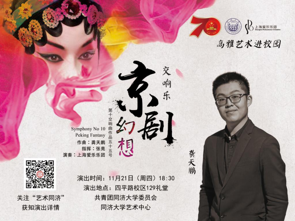 为庆祝新中国成立70周年,弘扬社会主义核心价值观和中华传统文化,丰富校园文化生活,高雅艺术进校园系列活动上海爱乐乐团交响乐《京剧幻想》将在我校四平路校区上演。