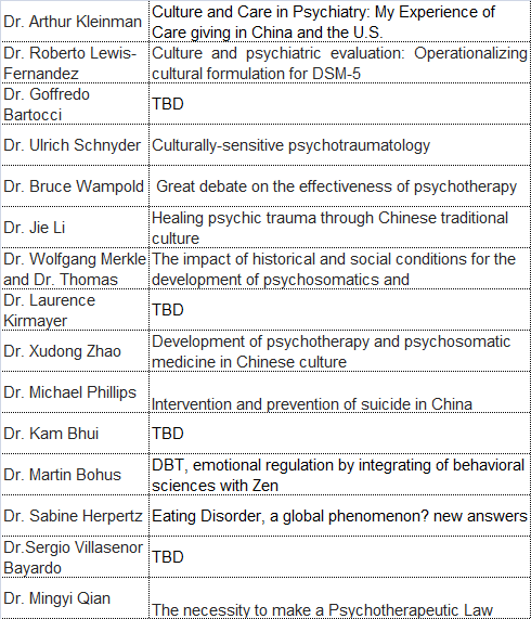大会邀请了国际、国内外著名专家做大会主旨报告、领衔举办专题分会及工作坊。除了主办方、协办方的学术技术带头人参会外,已经确认到会的世界级名专家有:Arthur Kleinman (USA), Bruce Wampold(USA), Ulrich Schnyder (Switzerland), Goffredo Bartocci (Italy),Sabine Herpertz (Germany), Laurence Kirmayer (Canada), Kamaldeep Bhui (UK), Roberto Lewis-Fernández (USA), Sergio Villaseñor Bayardo (Mexico), 及大会报告: