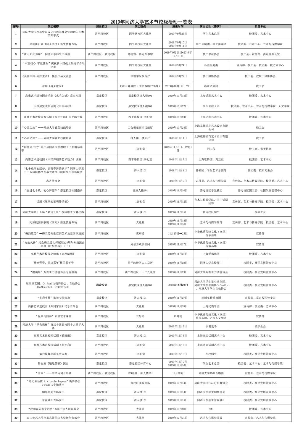 2019年同济大学艺术节校级活动一览表