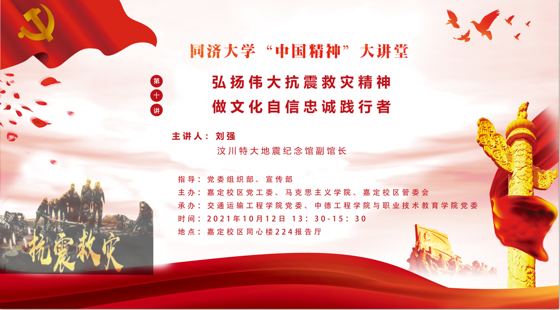 同济大学“中国精神”大讲堂第十讲将于10月12日13时30分在嘉定校区同心楼224报告厅开讲,特邀汶川特大地震纪念馆副馆长刘强主讲“弘扬伟大抗震救灾精神 做文化自信忠诚践行者”。