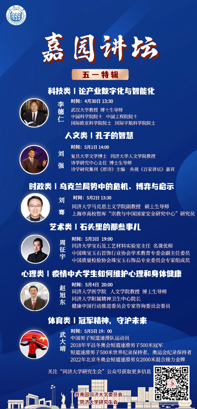 “嘉园讲坛”五一特辑还将继续举办5场报告会,邀请刘强、刘骞、周征宇、赵旭东、武大靖等校内外专家大咖围绕人文、时政、艺术、心理、体育等方面为同学们作线上专题报告,为同学们带来源源不断的知识“大餐”。