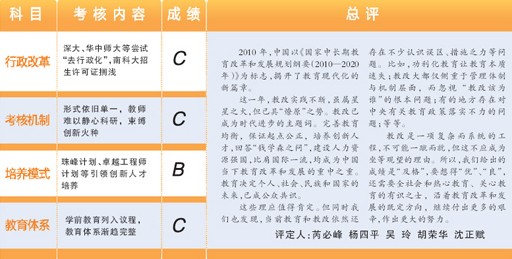 一年过去了。日前,记者专访11位教授中的5人,请他们为2010年度教改打分。在行政改革、考核机制、培养模式和教育体系四个“科目”中,5位教授打分相加、平均后,各科成绩依次为:C、C、B、C;总评:C(B为“良”,C为“及格”)(见上表)。