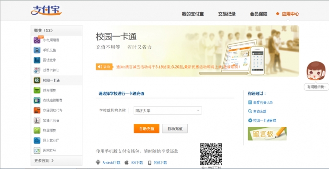 同济大学校园卡开通支付宝充值功能