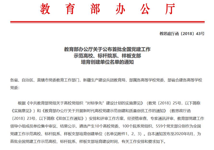 根据《教育部办公厅关于开展新时代高校党建示范创建和质量创优工作评审的通知》(教思政厅函〔2018〕23号)安排和评审工作方案,经资格审查、专家通讯评审、教育部党建工作领导小组成员单位集中审议,遴选产...