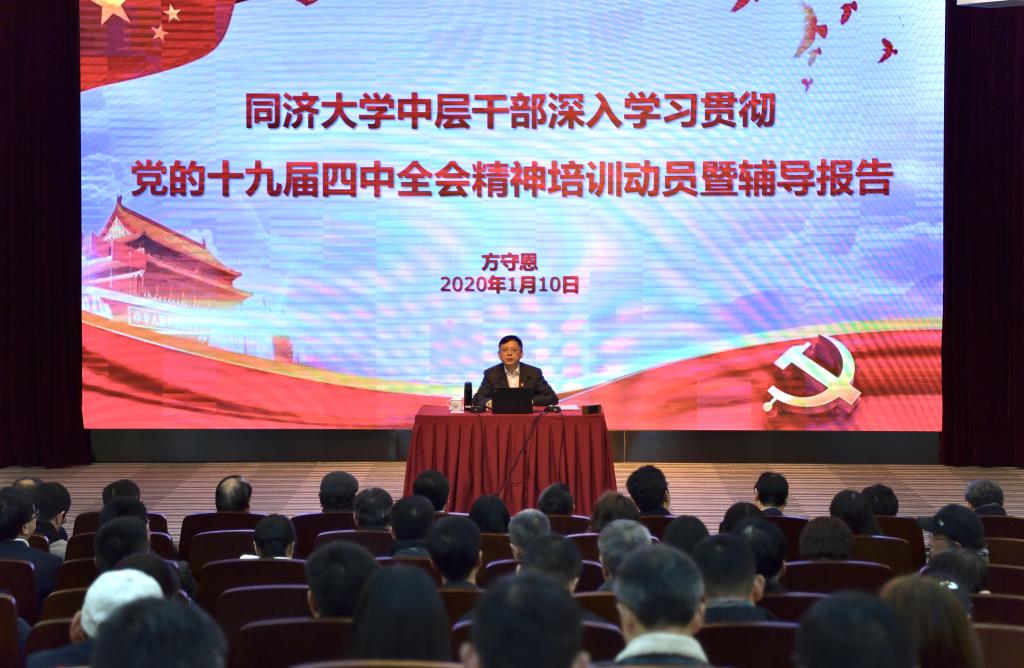 1月10日,同济大学中层干部学习贯彻党的十九届四中全会精神培训班开班仪式在四平路校区举行,同时在嘉定校区设置分会场。校党委书记方守恩作动员并作首场辅导报告。陈杰、伍江、蒋昌俊、徐建平、吕培明、方平、雷...