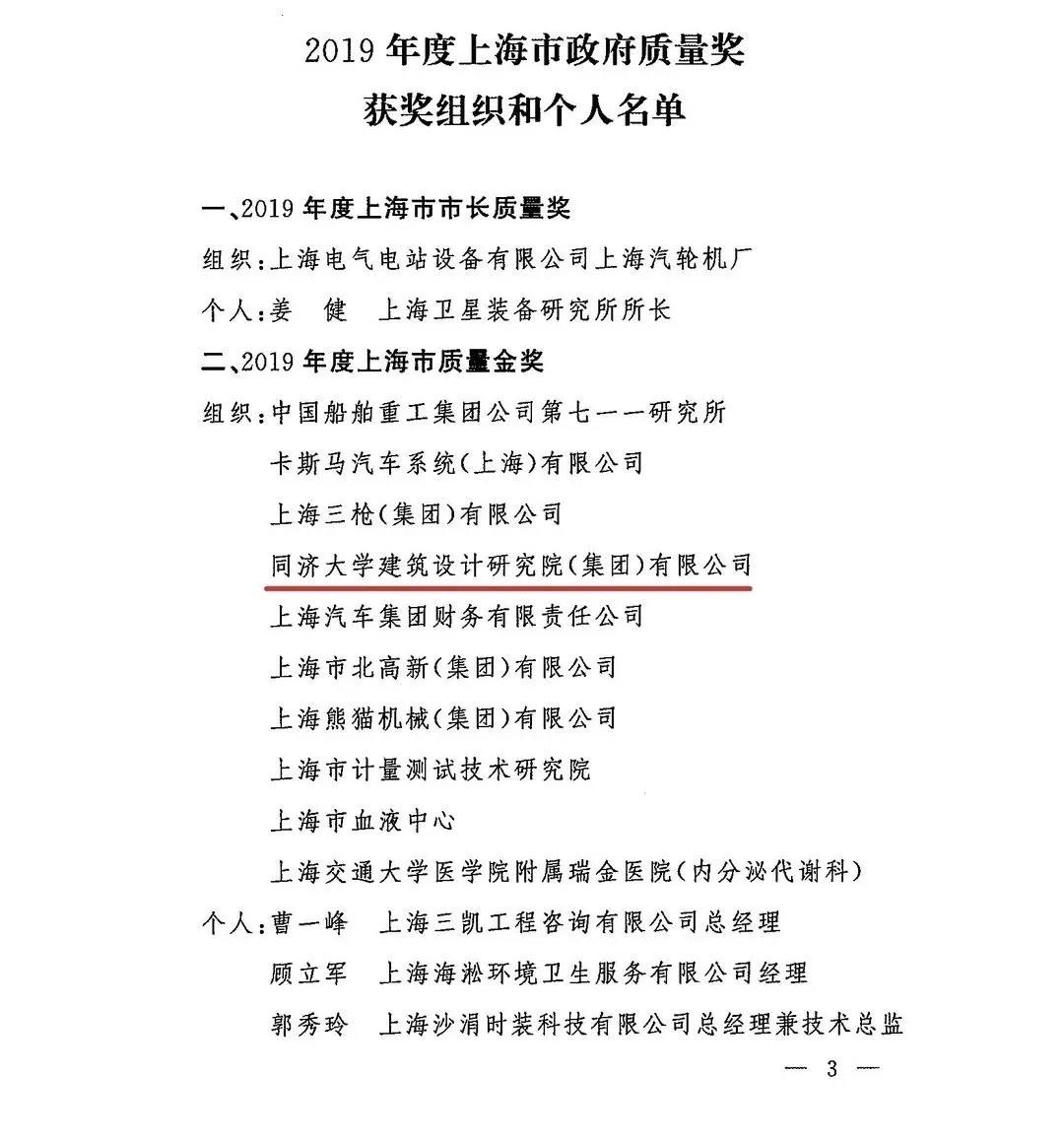 同济大学建筑设计研究院(集团)有限公司荣获2019年度上海市质量金奖