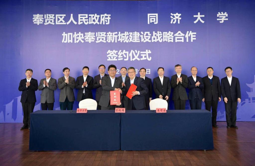 签约仪式在奉贤区举行。奉贤区委书记庄木弟、同济大学党委书记方守恩出席并讲话。奉贤区委副书记、代区长袁泉主持签约仪式。奉贤区委副书记骆大进,区委常委、组织部部长韦明,区委常委、副区长连正华,区政府副区长顾佾、吕将,同济大学校长陈杰,常务副校长吕培明,校党委副书记彭震伟,副校长童小华、黄翔峰,校长助理刘润出席,连正华、吕培明分别代表双方签约。
