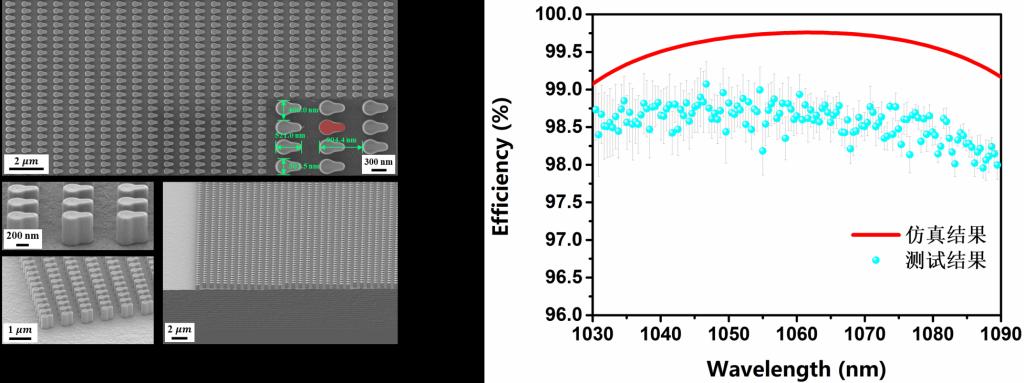 实验方面,使用电子束蒸发离子束辅助技术制备多层膜,电子束直写结合原子层沉积技术制备超表面,得到了如图5所示的准三维多层膜自由超光栅样品,非偏振宽带测试效率高达98%,实验和理论设计吻合良好,这也验证了制备和测试结果的准确性和可靠性。