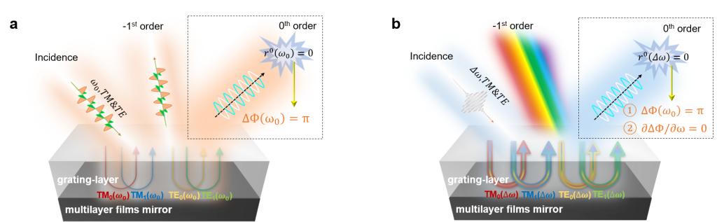 论文首先给出了实现单波长消偏振高效率的物理条件:调控利特罗入射下光栅层内两个Bragg模式之间的相位差π,并同时在两个偏振态下满足(如图2a);进一步地,调控Bragg模式相位差的宽带色散等于0,使宽带内相位差π保持不变,从而获得宽带消偏振高效率(如图2b)。