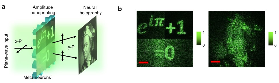 进一步,将FONM作为一个编码器分别编码振幅和相位剖面,以生成两幅图像,并通过近场的纳米打印和远场的神经全息展示,如图5a所示。其实验结果(5b)与仿真非常好的吻合。