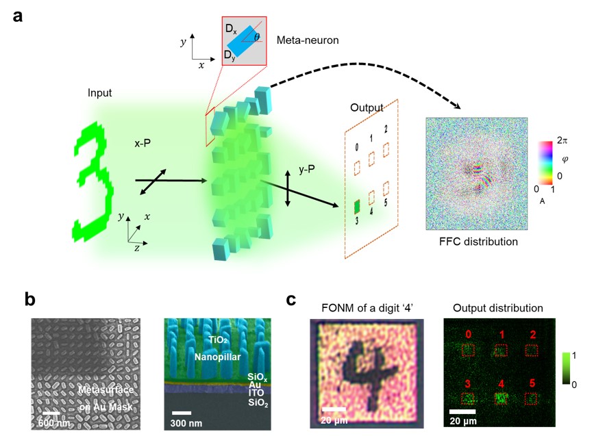 作为概念验证,首先将FONM设计为一个分类器,可以识别0到5的手写数字,如图3a所示。该器件是通过电子束直写和原子层沉积工艺制作完成,其顶视和剖视SEM结果如图3b所示。以数字“4”的输入为例,测试了网络的输出,如图3c所示,结果表明最大的光强被聚焦在对应的正确区域,识别是成功的。
