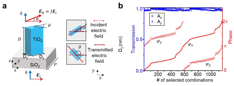 为了在FONM中实现任意且独立的振幅和相位调制,文章采用矩形双折射纳米柱结构,如图2a所示。在x偏振光入射和y偏振光出射时,满足振幅匹配